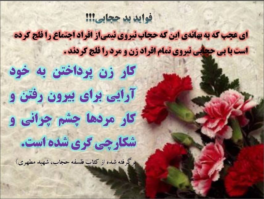 وی در جای دیگری از کتاب خود میافزاید: "اما با وارد شدن حجاب به عرصه زندگی، معیارهایی مثل مادر بودن، احترام و حتی مفهوم خانواده و عفاف را درک کردیم."